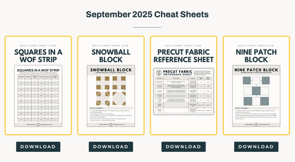 The Quilt Cheat Sheet Club works differently because it shows up for you every month. Fresh cheat sheets land in your inbox, reminding you they’re there. You print them, slip them in a binder, and actually reach for them when you’re stuck.